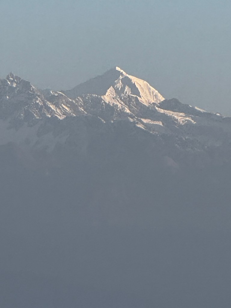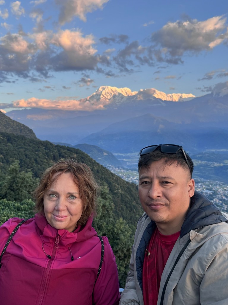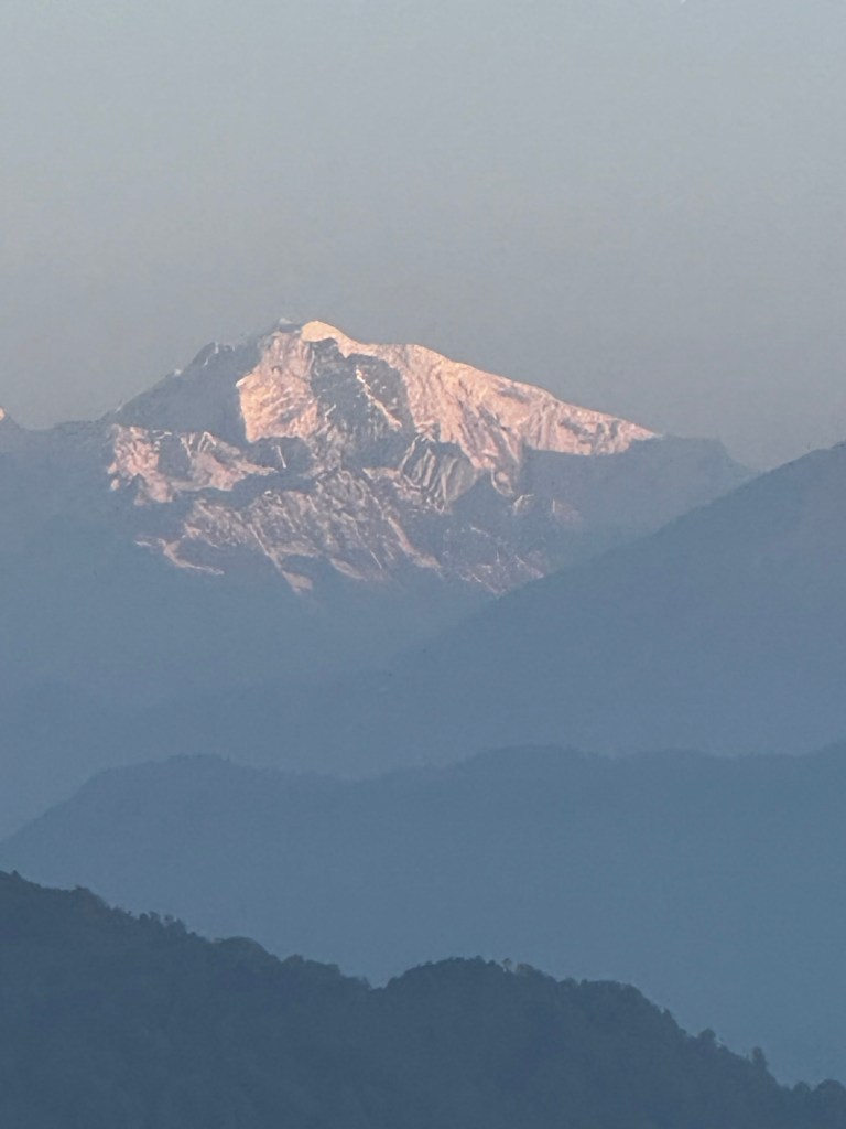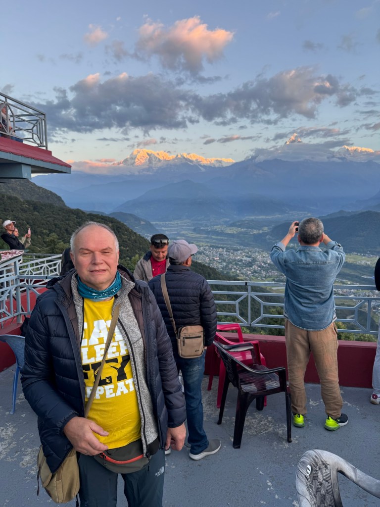 Zdążyliśmy. Przed nami rozpościerał się łańcuch Himalajów – w świetle wschodu majaczyły Langtang i Gaurishankar, a przy dobrej widoczności podobno widać nawet dalsze masywy Everestu. Gdy promienie przebiły się przez poranną mgłę, ludzie wokół zaczęli bić brawo – jakby witali słońce.