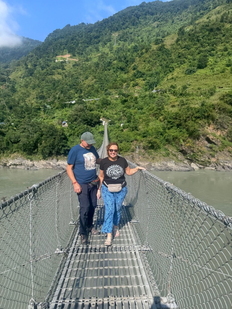 Nepal to była prawdziwa podróż – raz autostradą, raz wąską, szutrową drogą pełną zakrętów i pyłu. Mijaliśmy wioski, pola ryżowe i wiszące mosty, kołyszące się nad rzekami w rytmie wiatru i kroków. Każdy kilometr przynosił coś nowego – krajobraz, zapach, uśmiech ludzi.