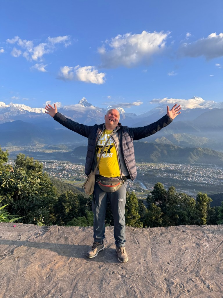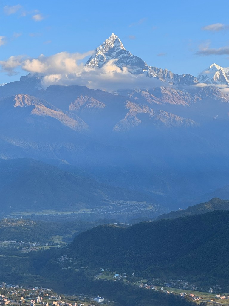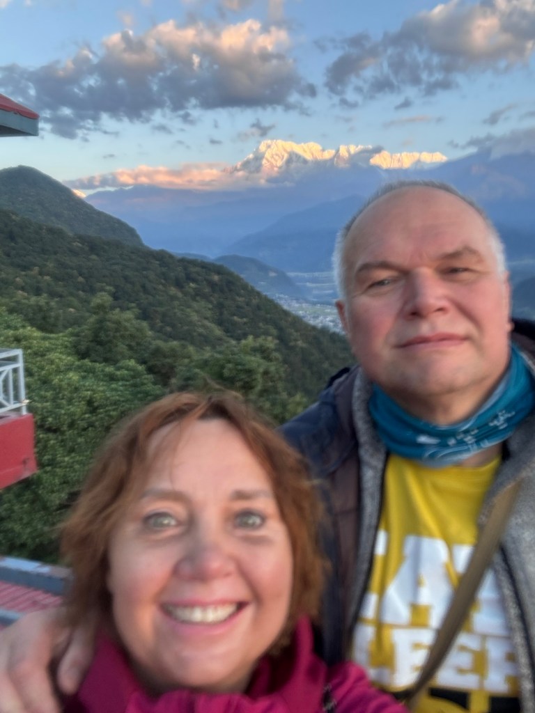 Tego dnia nie jechaliśmy dalej. Zatrzymaliśmy się w Pokharze – u stóp Himalajów, gdzie Annapurna wyłaniała się zza gór, oświetlona porannym słońcem. Wjechaliśmy na pobliskie wzgórze; stamtąd rozciągał się widok jak z pocztówki. To właśnie z okolic Sarangkot startują paralotniarze – raj dla lotów nad Himalajami.