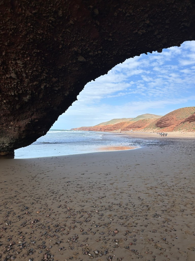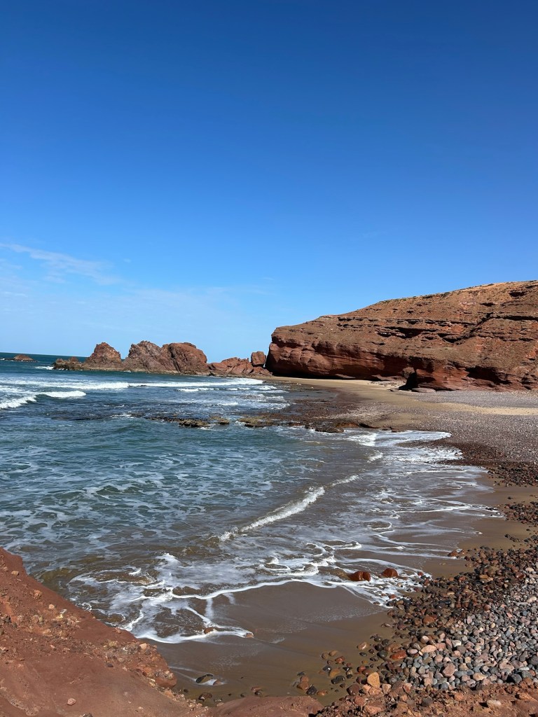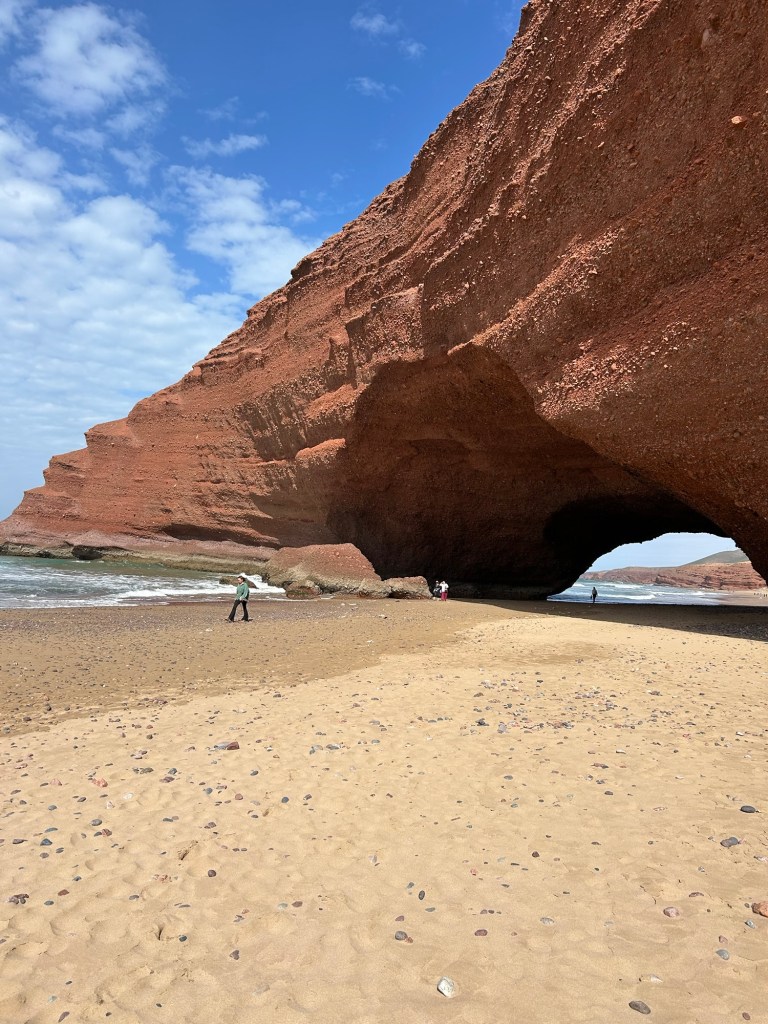Czerwona skała spotyka Atlantyk, kamienne łuki wyrastają z klifu, a ocean co chwilę próbuje je zabrać. Jeden z nich już zniknął. Rozsypał się. Legzira uczy, że nic nie jest na zawsze. Nie przyjeżdża się tu po atrakcję, tylko po moment — po wiatr, sól na skórze i ciszę przerywaną falą.