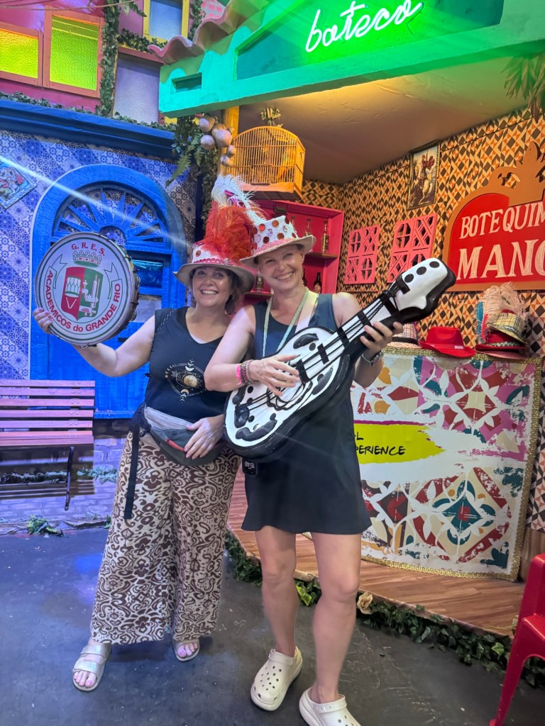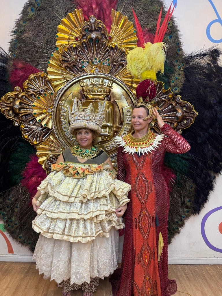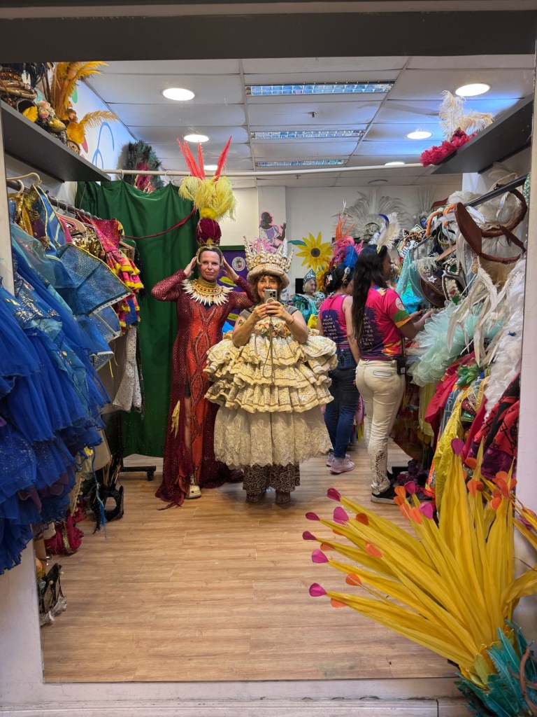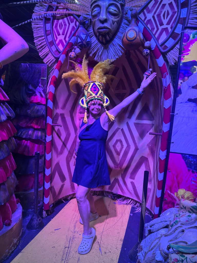 Po powrocie do Rio zajrzeliśmy jeszcze do Miasta Samby, żeby zobaczyć, jak powstają te niezwykłe konstrukcje i kostiumy, które nocą na Sambodromie wyglądają jak czysta magia. Nawet przebraliśmy się w karnawałowe stroje, by choć na chwilę poczuć się jak artyści jednej ze szkół samby.